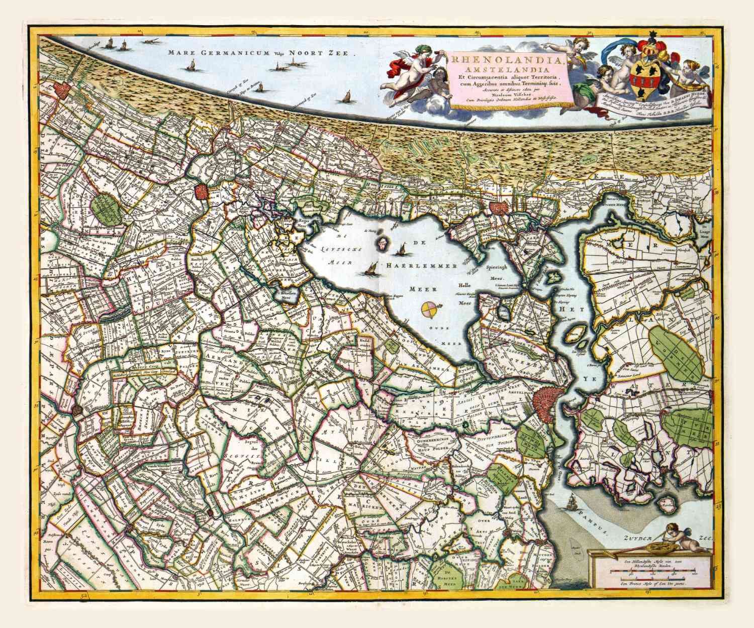 Kaart van Rijnland en Amstelland, met o.a. Amsterdam, de Haarlemmermeer en Leiden, in 1680 uitgegeven door Nicolaes Visscher.