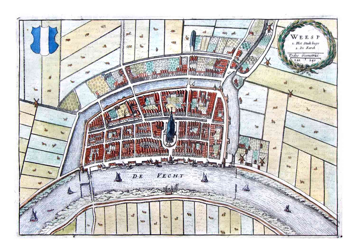 Ingekleurde kaart van Weesp aan de Vecht, in 1632 uitgegeven door Boxhorn.