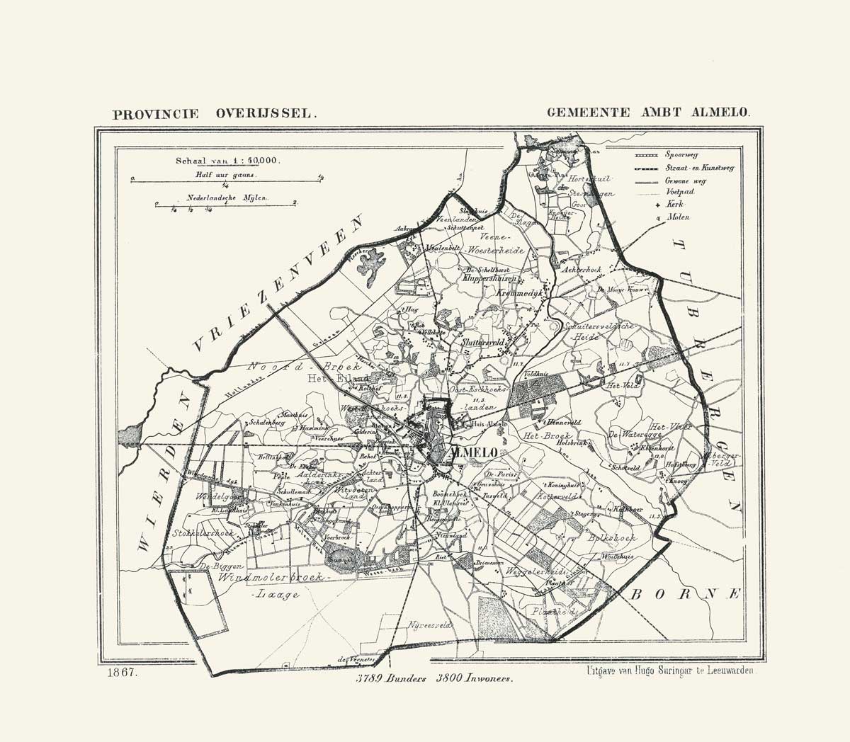 Deze Oude kaart Almelo 1867 biedt een uiterst gedetailleerd en historisch overzicht van de toenmalige gemeenten Stad- en Ambt Almelo tijdens de tweede helft van de negentiende eeuw. De lithografie toont de karakteristieke structuur van de stad en het uitgestrekte omliggende buitengebied met een opmerkelijke helderheid voor de kijker. Bovendien brengt Kuyper de verschillende buurtschappen, de verspreid liggende boerenhoeven en het monumentale Kasteel Huize Almelo uiterst scherp in beeld. In dit gezicht op Almelo valt de vroege industriële expansie langs de waterwegen en de gunstige ligging aan de nieuwe spoorweginfrastructuur direct op, wat getuigt van de transformatie die de stad doormaakte door de opkomst van de grootschalige textielnijverheid. Verder ziet u de loop van de Almelose Aa, de verschillende blekerijen en de historische wegenstructuur van het Twentse landschap met grote precisie weergegeven. Daardoor krijgt het werk een krachtige en authentieke uitstraling, typerend voor de negentiende-eeuwse Nederlandse cartografie.