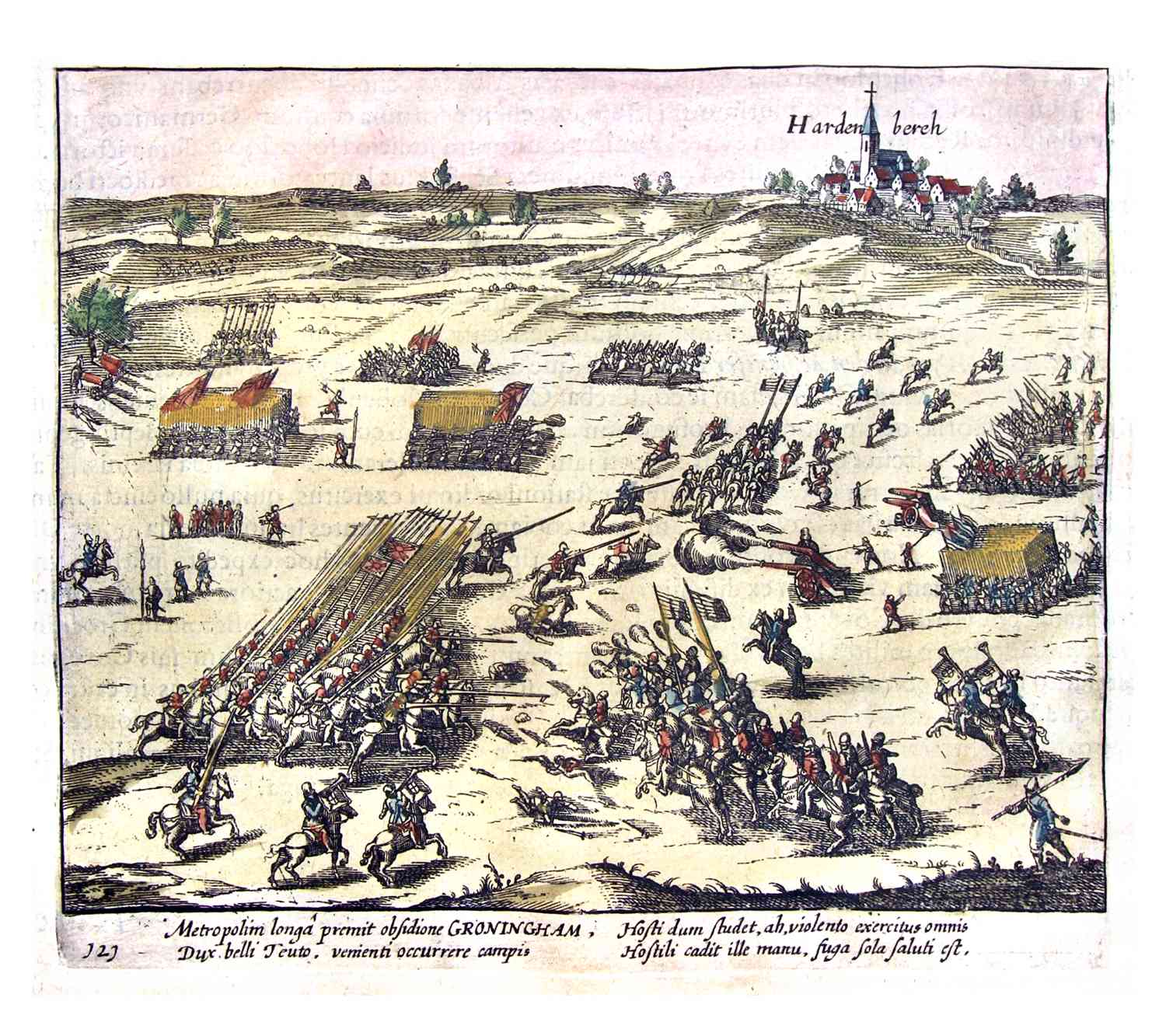 Ingekleurde afbeelding van de belegering van Hardenberg, in 1622 gepubliceerd door Baudartius.
