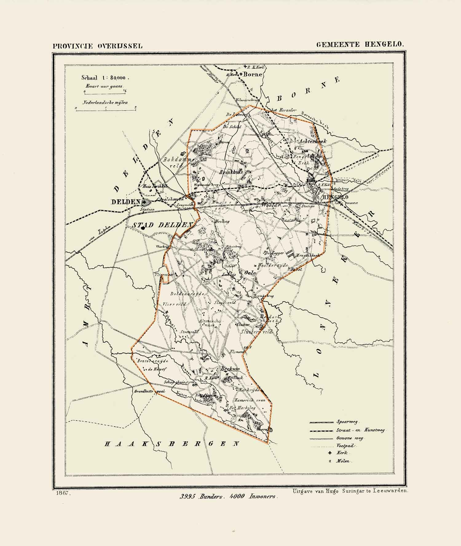 Deze Oude kaart Hengelo 1867 biedt een uiterst gedetailleerd en historisch overzicht van dit Twentse industriële centrum tijdens de tweede helft van de negentiende eeuw. De lithografie toont de dorpskern en het omliggende buitengebied met een opmerkelijke helderheid voor de kijker. Bovendien brengt Kuyper de vroege stadsexpansie, de opkomst van de metaalindustrie en de strategische ligging aan het nieuwe spoorwegknooppunt uiterst scherp in beeld. In dit gezicht op Hengelo valt de transformatie van een agrarisch dorp naar een moderne fabrieksstad direct op, wat getuigt van de enorme economische impuls die de regio Twente in deze periode doormaakte. Verder ziet u de loop van de verschillende beken, de verspreid liggende boerenhoeven en de uitgestrekte essen met grote precisie weergegeven. Daardoor krijgt het werk een krachtige en authentieke uitstraling, typerend voor de negentiende-eeuwse Nederlandse cartografie.