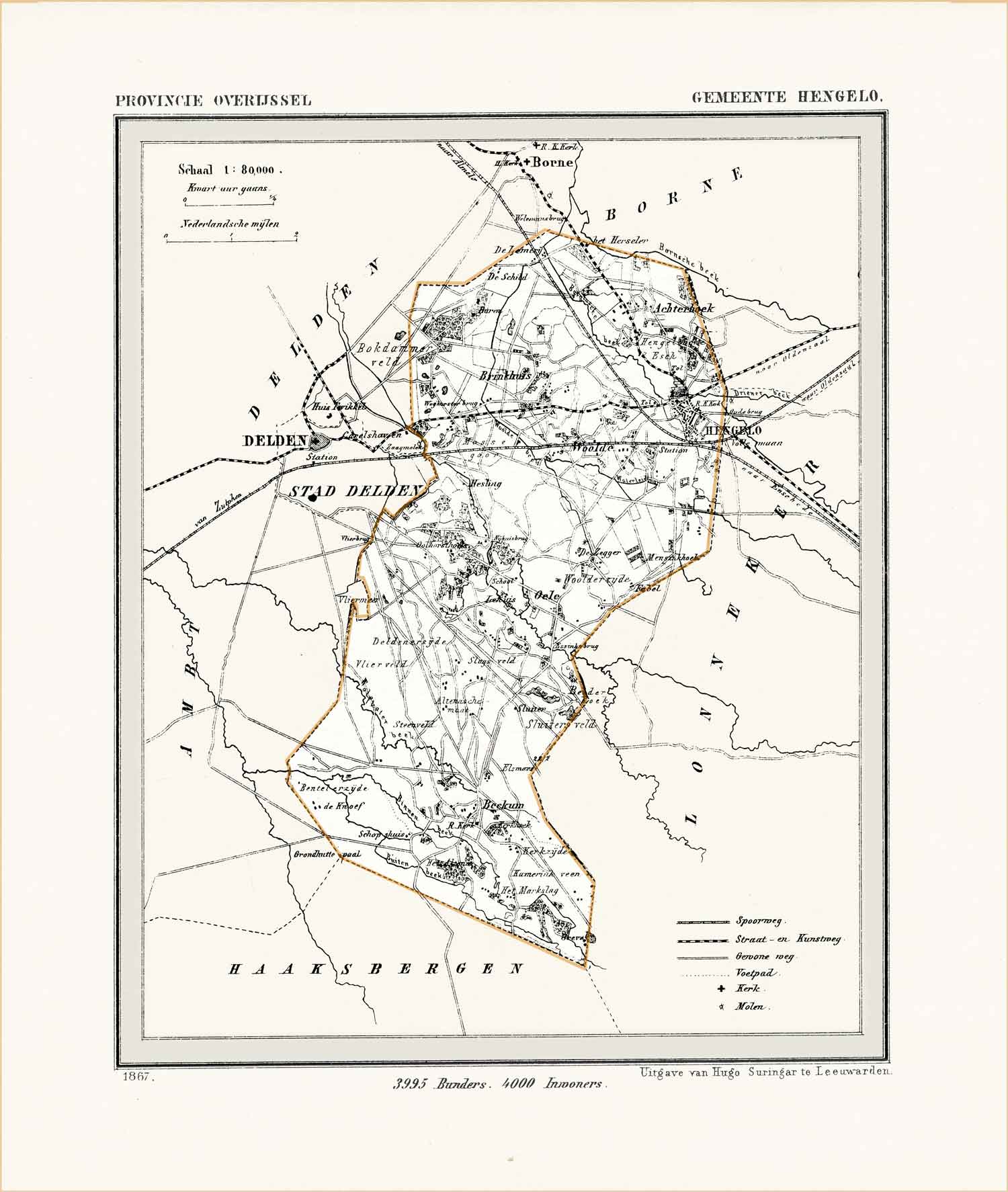 Deze Oude kaart Hengelo 1867 biedt een uiterst gedetailleerd en historisch overzicht van dit Twentse industriële centrum tijdens de tweede helft van de negentiende eeuw. De lithografie toont de dorpskern en het omliggende buitengebied met een opmerkelijke helderheid voor de kijker. Bovendien brengt Kuyper de vroege stadsexpansie, de opkomst van de metaalindustrie en de strategische ligging aan het nieuwe spoorwegknooppunt uiterst scherp in beeld. In dit gezicht op Hengelo valt de transformatie van een agrarisch dorp naar een moderne fabrieksstad direct op, wat getuigt van de enorme economische impuls die de regio Twente in deze periode doormaakte. Verder ziet u de loop van de verschillende beken, de verspreid liggende boerenhoeven en de uitgestrekte essen met grote precisie weergegeven. Daardoor krijgt het werk een krachtige en authentieke uitstraling, typerend voor de negentiende-eeuwse Nederlandse cartografie.