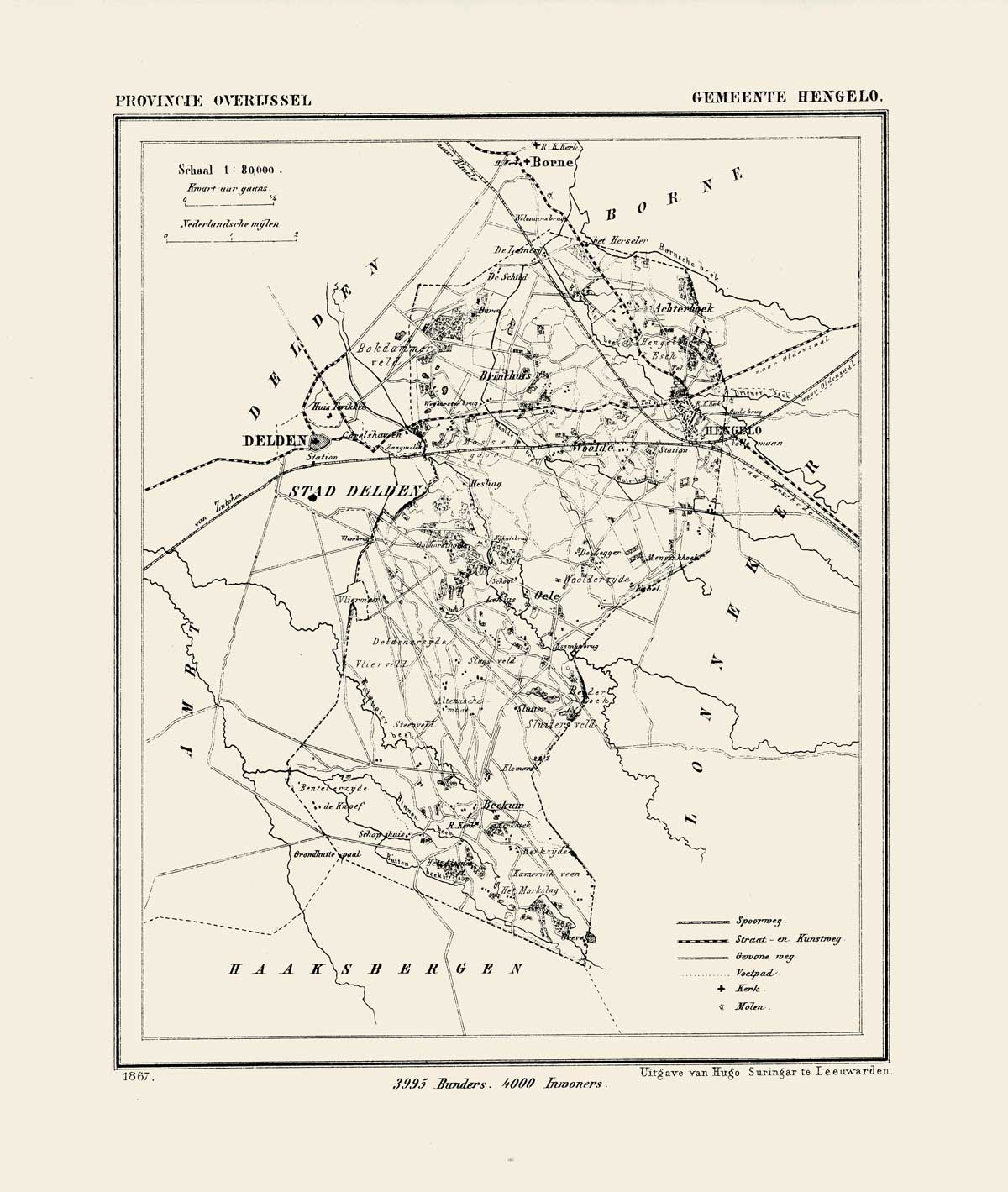 Deze Oude kaart Hengelo 1867 biedt een uiterst gedetailleerd en historisch overzicht van dit Twentse industriële centrum tijdens de tweede helft van de negentiende eeuw. De lithografie toont de dorpskern en het omliggende buitengebied met een opmerkelijke helderheid voor de kijker. Bovendien brengt Kuyper de vroege stadsexpansie, de opkomst van de metaalindustrie en de strategische ligging aan het nieuwe spoorwegknooppunt uiterst scherp in beeld. In dit gezicht op Hengelo valt de transformatie van een agrarisch dorp naar een moderne fabrieksstad direct op, wat getuigt van de enorme economische impuls die de regio Twente in deze periode doormaakte. Verder ziet u de loop van de verschillende beken, de verspreid liggende boerenhoeven en de uitgestrekte essen met grote precisie weergegeven. Daardoor krijgt het werk een krachtige en authentieke uitstraling, typerend voor de negentiende-eeuwse Nederlandse cartografie.