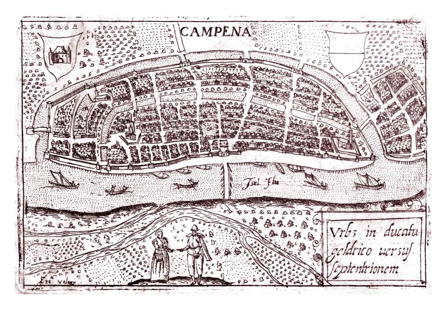 Klein ongekleurd kaartje van Kampen in 1713 uitgegeven door Valegio.