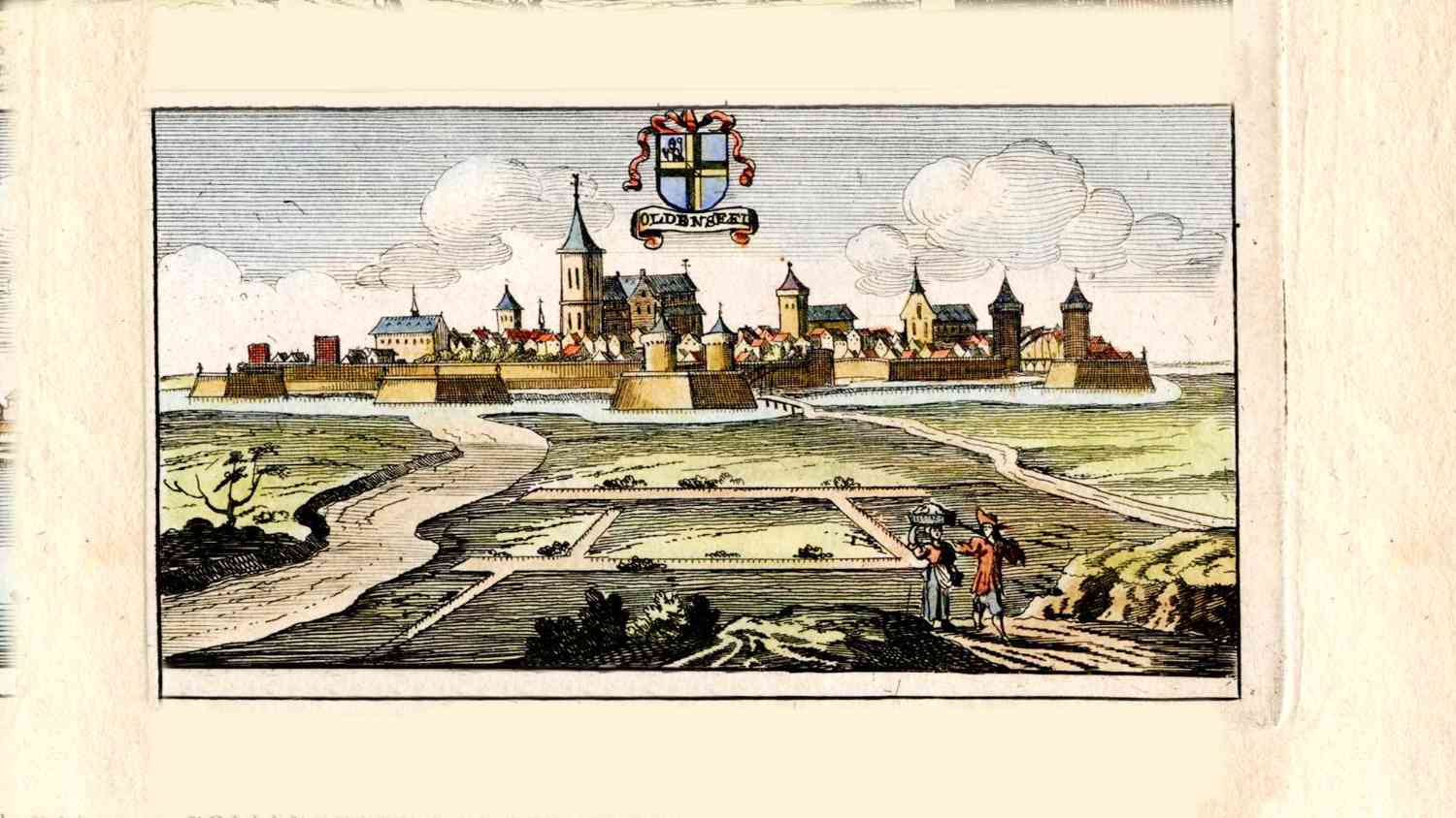 Kleine ingekleurde gravure van Oldenzaal in 1674 uitgegeven door Bouttats.
