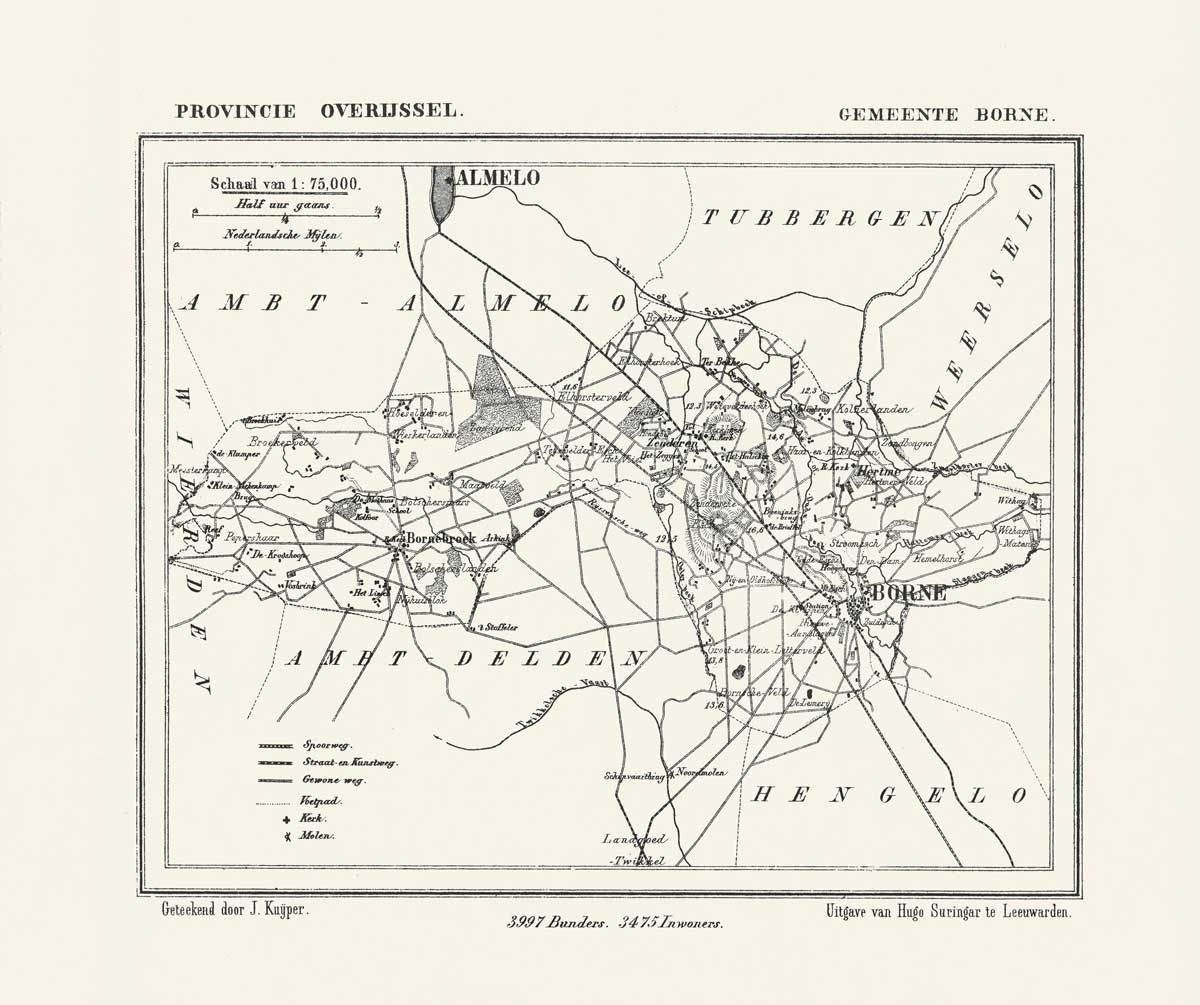 Deze Oude kaart Borne 1867 biedt een uiterst gedetailleerd en historisch overzicht van deze Twentse gemeente tijdens de tweede helft van de negentiende eeuw. De lithografie toont de dorpskern en het omliggende buitengebied met een opmerkelijke helderheid voor de kijker. Bovendien brengt Kuyper de verschillende buurtschappen, zoals Zenderen en Hertme, en de verspreid liggende boerenhoeven uiterst scherp in beeld. In dit gezicht op Borne valt de vroege industriële ontwikkeling en de gunstige ligging aan de spoorlijn Almelo-Salzbergen direct op, wat getuigt van de transformatie die het dorp doormaakte door de opkomst van de textielnijverheid. Verder ziet u de loop van de Bornse Beek, de uitgestrekte essen en de historische wegenstructuur van het Twentse landschap met grote precisie weergegeven. Daardoor krijgt het werk een krachtige en authentieke uitstraling, typerend voor de negentiende-eeuwse Nederlandse cartografie.