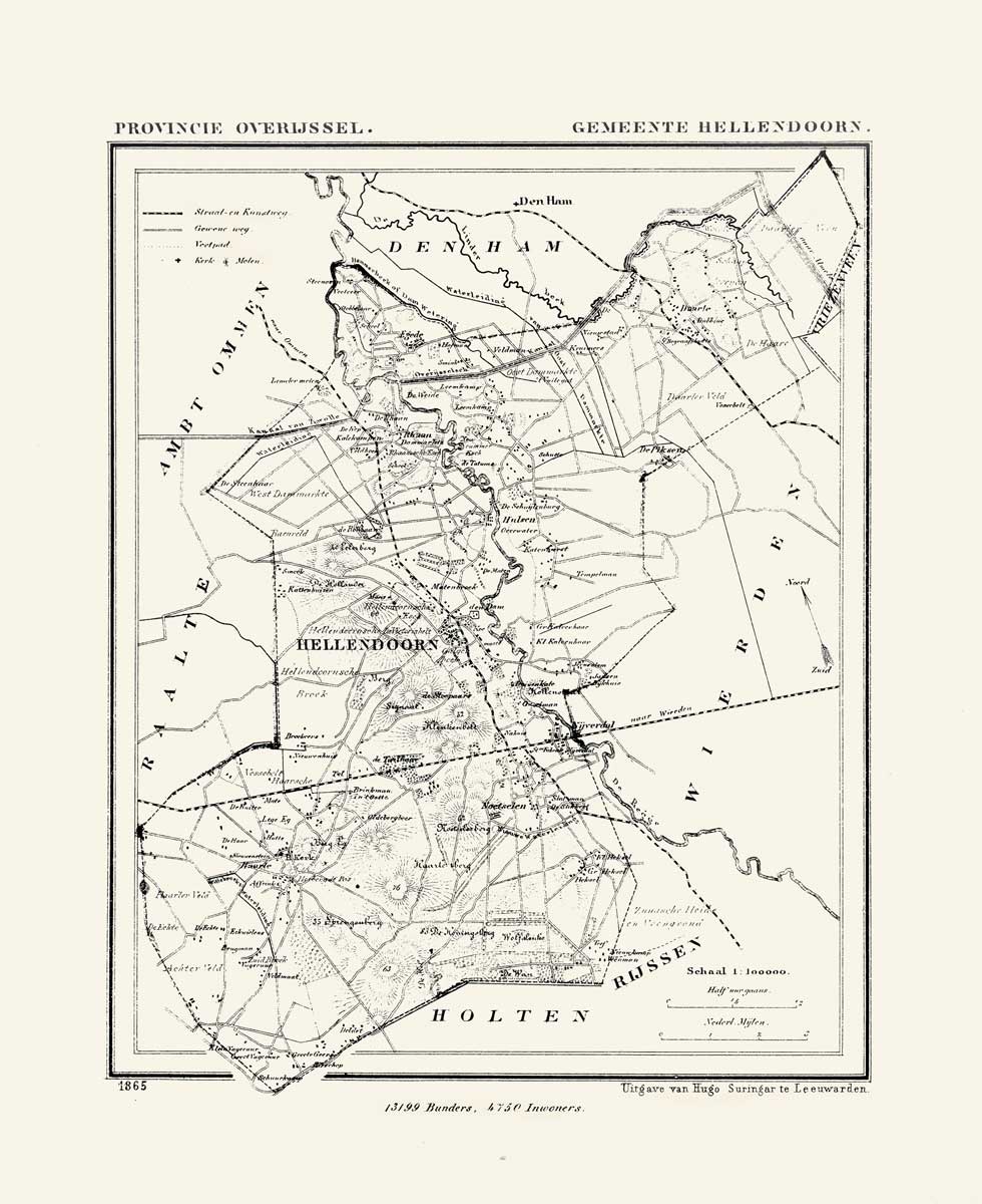 Deze Oude kaart Hellendoorn 1865 biedt een uiterst gedetailleerd en historisch overzicht van deze Overijsselse gemeente op de grens van Salland en Twente tijdens de tweede helft van de negentiende eeuw. De lithografie toont het gevarieerde landschap met een opmerkelijke helderheid voor de kijker. Bovendien brengt Kuyper de verschillende kernen, zoals de dorpskom van Hellendoorn en het opkomende industriële Nijverdal, uiterst scherp in beeld. In dit gezicht op Hellendoorn valt de vroege industriële ontwikkeling langs de Regge direct op, wat getuigt van de grote betekenis van de textielnijverheid van de gebroeders Salomonson voor de groei van de regio. Verder ziet u de uitgestrekte heidevelden van de Sallandse Heuvelrug, de vroege wegenstructuur en de loop van de Regge met grote precisie weergegeven. Daardoor krijgt het werk een krachtige en authentieke uitstraling, typerend voor de negentiende-eeuwse Nederlandse cartografie.