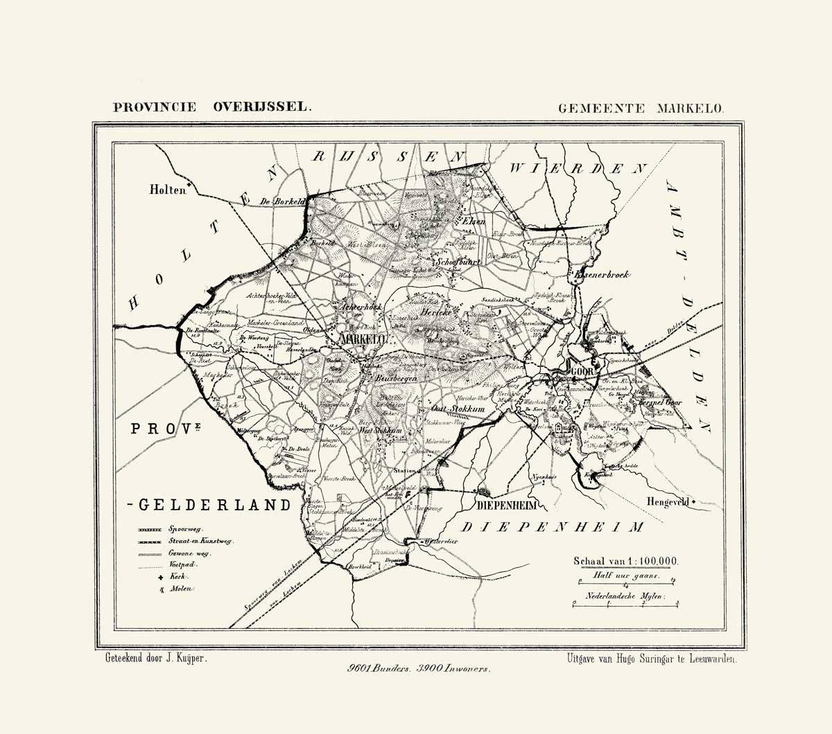 Deze Oude kaart Markelo 1867 biedt een uiterst gedetailleerd en historisch overzicht van deze Overijsselse gemeente in het hart van Twente tijdens de tweede helft van de negentiende eeuw. De lithografie toont het glooiende landschap rondom de bekende Markelose Berg met een opmerkelijke helderheid voor de kijker. Bovendien brengt Kuyper de dorpskern, de verspreid liggende buurtschappen zoals Dijkerhoek, Stokkum en Herike, en de vele historische boerenhoeven uiterst scherp in beeld. In dit gezicht op Markelo valt de harmonieuze verdeling tussen de essen, de weidegronden en de uitgestrekte heidevelden direct op, wat getuigt van de eeuwenoude agrarische structuur van dit deel van Twente. Verder ziet u de loop van de Schipbeek, de vroege wegenstructuur en de kenmerkende houtwallen met grote precisie weergegeven. Daardoor krijgt het werk een krachtige en authentieke uitstraling, typerend voor de negentiende-eeuwse Nederlandse cartografie.