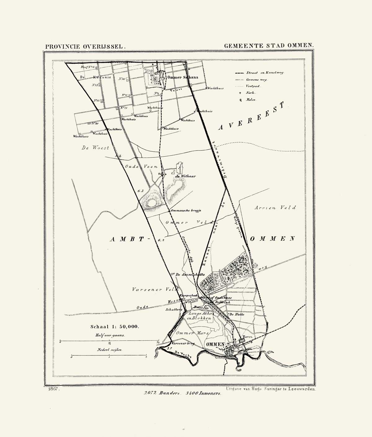 Deze Oude kaart Ommen 1867 biedt een uiterst gedetailleerd en historisch overzicht van deze Overijsselse gemeente in het Vechtdal tijdens de tweede helft van de negentiende eeuw. De lithografie toont het uitgestrekte landschap met een opmerkelijke helderheid voor de kijker. Bovendien brengt Kuyper de compacte stadskern van Ommen, de omliggende buurtschappen en de verspreid liggende boerenhoeven uiterst scherp in beeld. In dit gezicht op Ommen valt de natuurlijke loop van de Overijsselse Vecht direct op, wat getuigt van de eeuwenlange betekenis van de rivier voor de handel en de verbinding met het achterland. Verder ziet u de uitgestrekte heidevelden, de vroege ontginningen en de zandwegen die het Overijsselse landschap destijds kenmerkten met grote precisie weergegeven. Daardoor krijgt het werk een krachtige en authentieke uitstraling, typerend voor de negentiende-eeuwse Nederlandse cartografie.