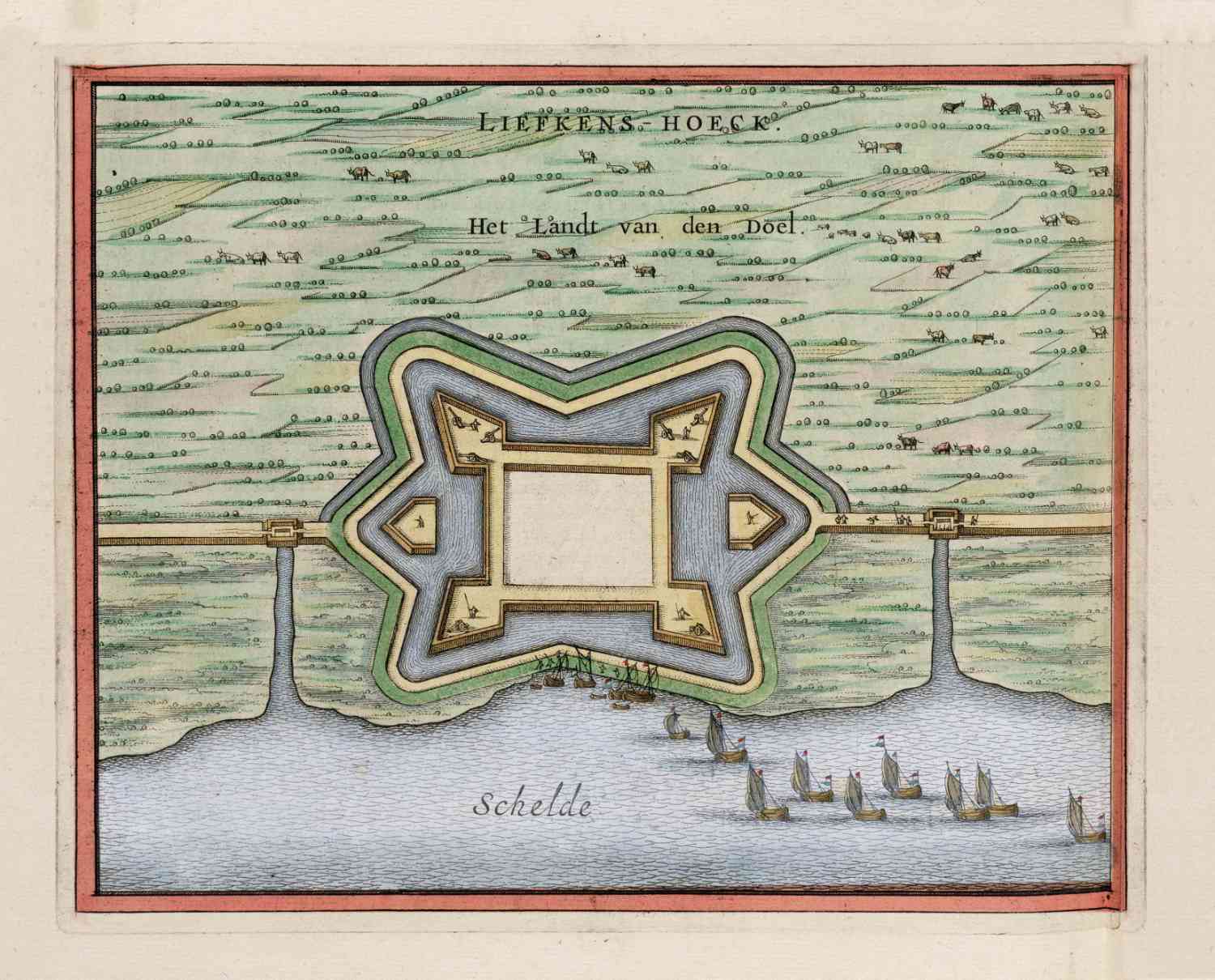 Kaart van het Fort Liefkenshoek aan de Schelde op de grens van Belgie en Nederland, in 1649 uitgegeven door Joan Blaeu.