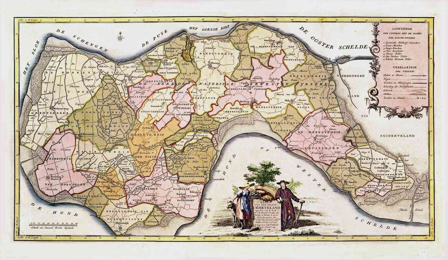Kaart van Beveland, Zeeland, in 1753 uitgegeven door Hattinga en Tirion.