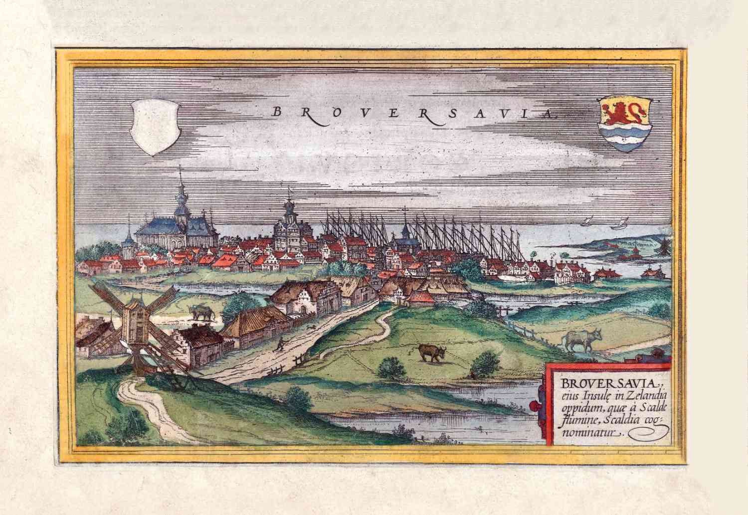Gezicht op Brouwershaven in 1582 uitgegeven door Braun en Hogenberg.