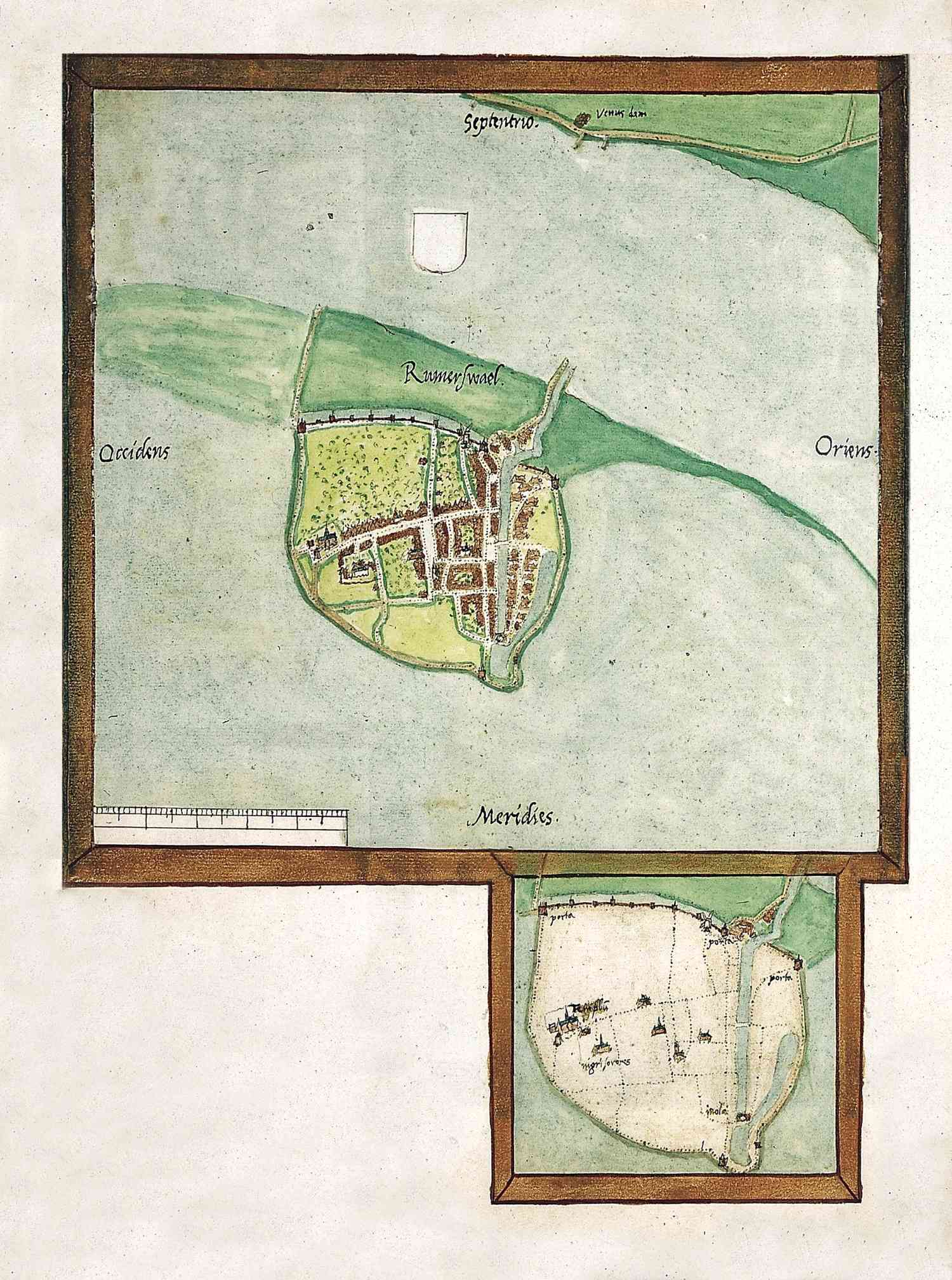 Zeer oude stadsplattegrond van Reimerswaal, handgetekend door Jacob van Deventer in 1545.