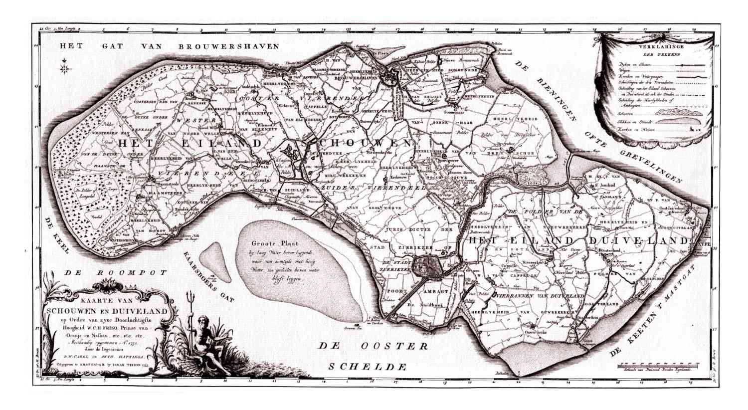 Ongekleurde kaart van het Zeeuwse eiland Schouwen, in 1753 uitgegeven door Hattinga en Tirion.