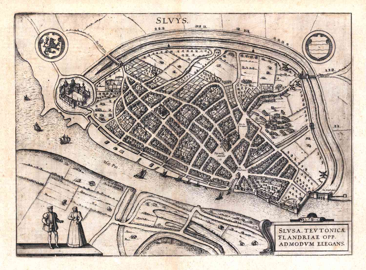 Zeer oude stadsplattegrond van Sluis in Zeeland, in 1572 uitgegeven door Braun en Hogenberg.