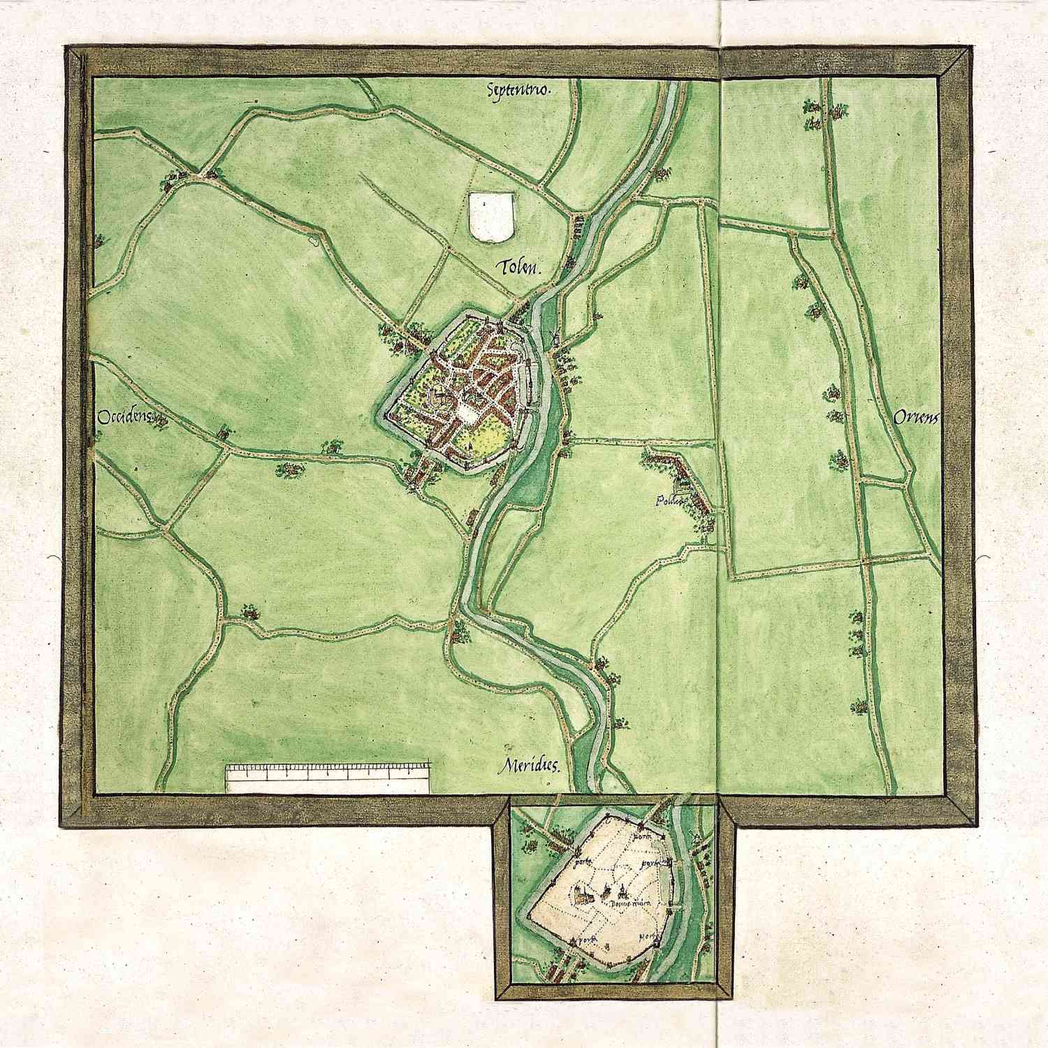 Zeer oude handgetekende kaart van Tholen, in 1545 gemaakt door Jacob van Deventer.