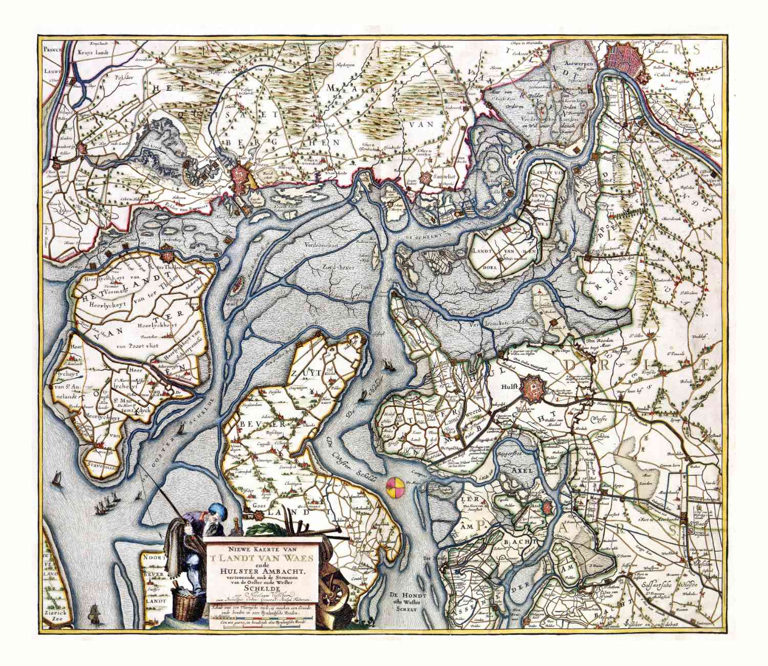 Kaart van Zeeland, ‘t Land van Waes en Zeeuws Vlaanderen met o.a. Antwerpen, Hulst, Axel en Bergen op Zoom, in 1681 uitgegeven door Nicolaes Visscher.