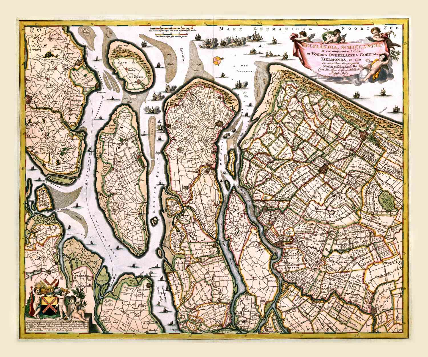 Kaart van Zuid Holland, Delfland en omgeving Rotterdam, in 1681 uitgegeven door Visscher.