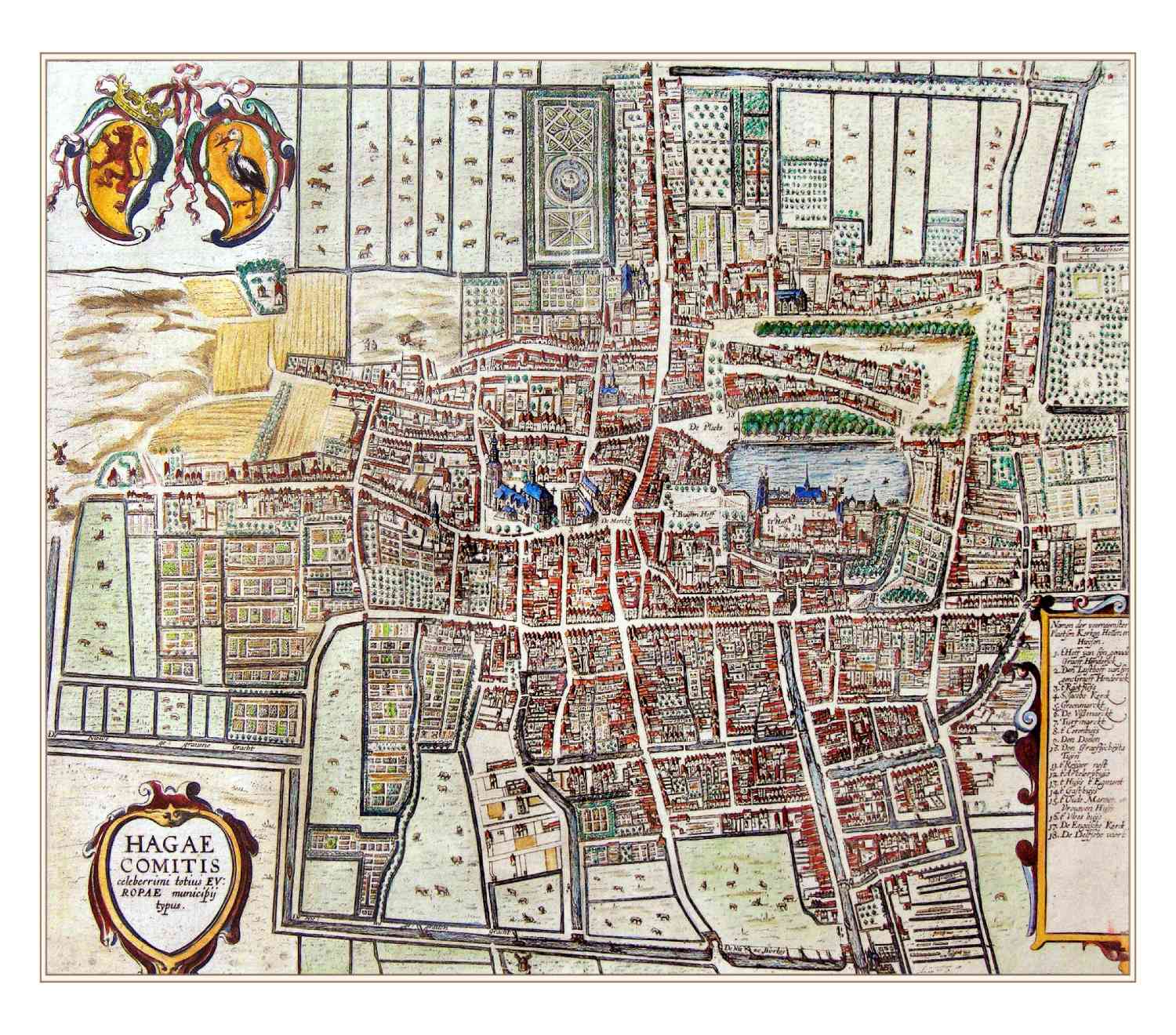 Vroege ingekleurde kaart van Den Haag in 1595 gepubliceerd door Braun en Hogenberg.