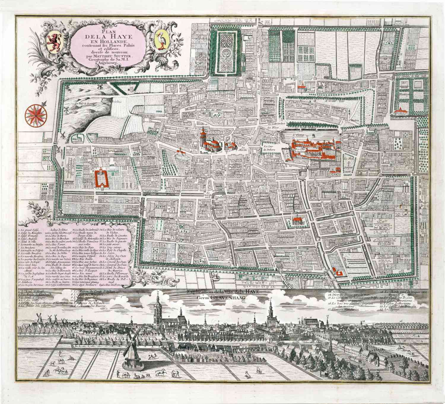 Zeer gedetailleerde stadsplattegrond met aangezicht van Den Haag, 1740 uitgegeven door Matthias Seutter.