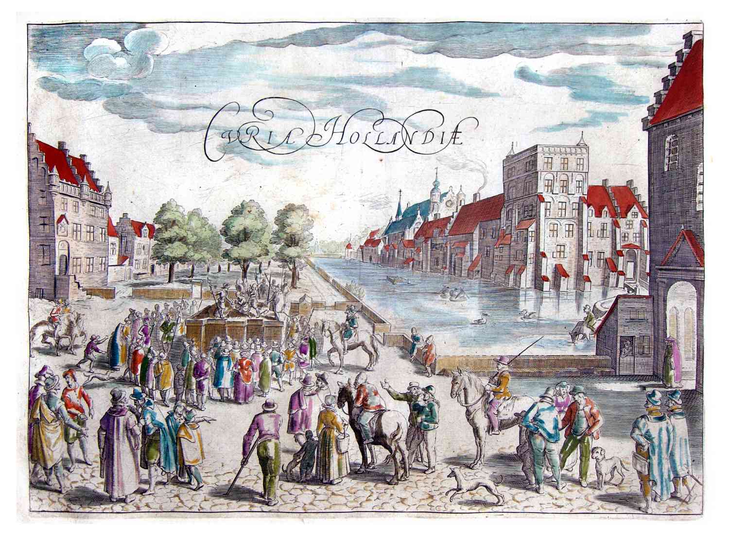 Blik op de Hofvijver en de parlementsgebouwen in Den Haag in 1615 uitgegeven door Orlers.