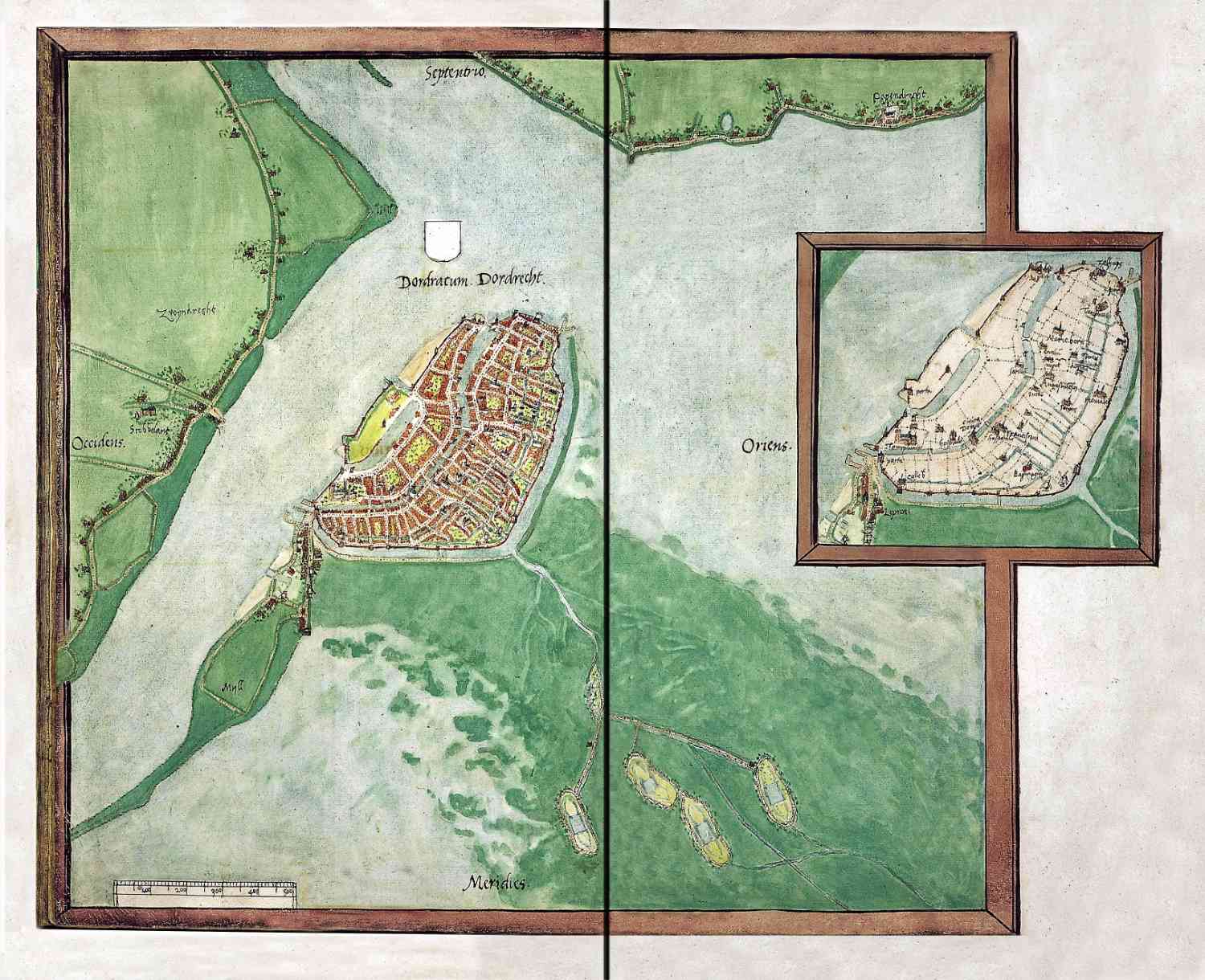 Zeer oude stadsplattegrond van Dordrecht, handgetekend in 1545 door Jacob van Deventer.
