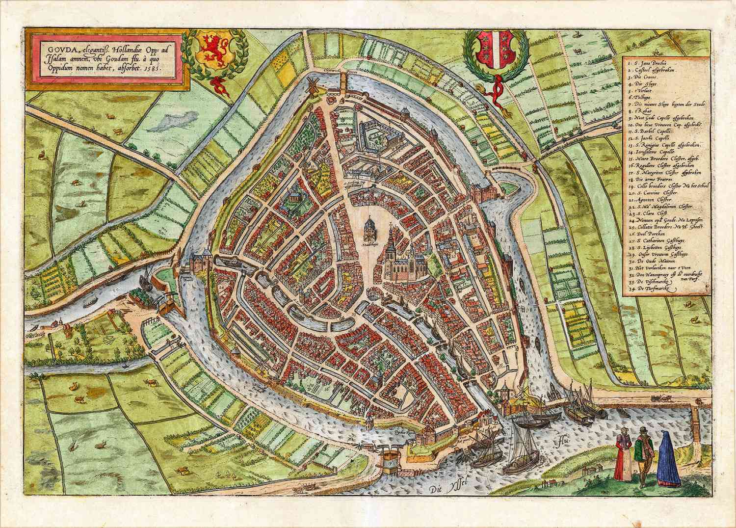 Fraai ingekleurde stadsplattegrond van Gouda, in 1617 uitgegeven door Braun en Hogenberg.