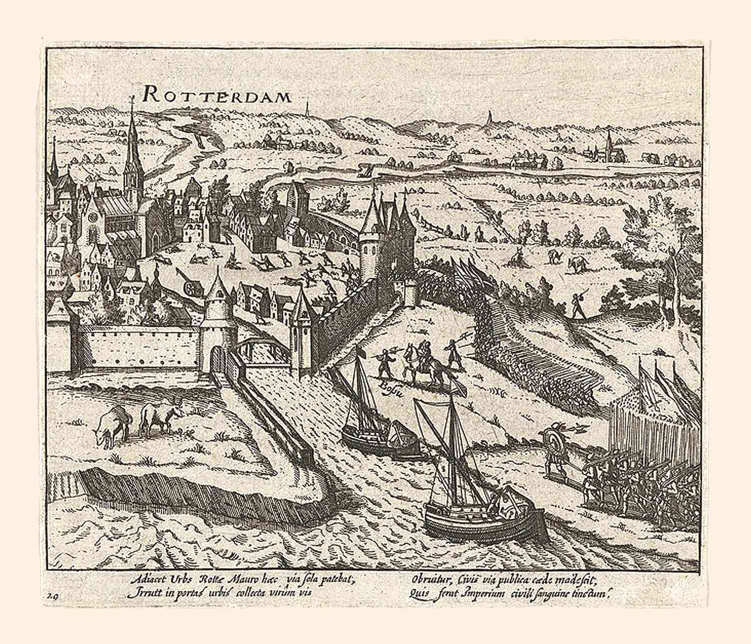 Gezicht op Rotterdam in 1572 uitgegeven door Baudartius.