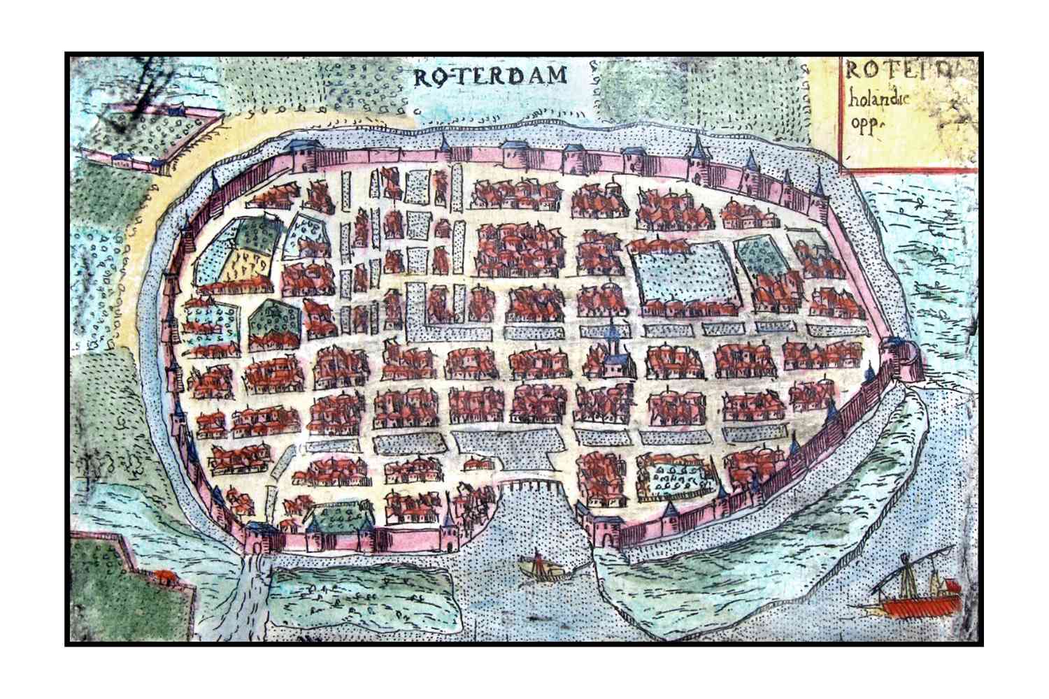 Zeer oud ingekleurd kaartje van Rotterdam, in 1575 gepubliceerd door Valegio.