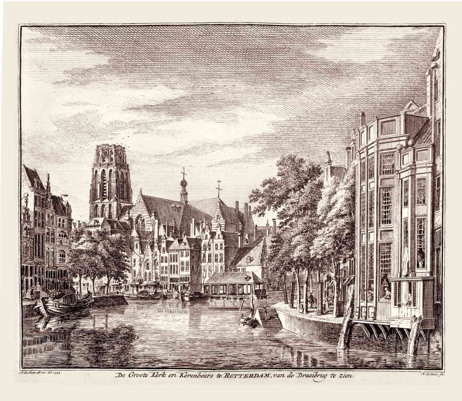 Ongekleurde gravure van de Groote Kerk en de Korenbeurs in Rotterdam vanaf de draaibrug gezien, in 1773 gepubliceerd door Spilman.