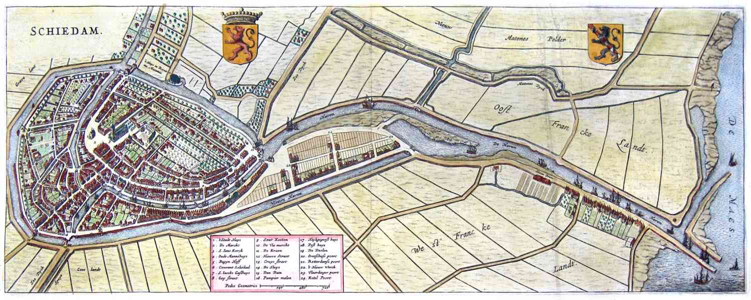Prachtige ingekleurde kaart aan Schiedam en de verbinding met de Maas, in 1649 gepubliceerd door Joan Blaeu.