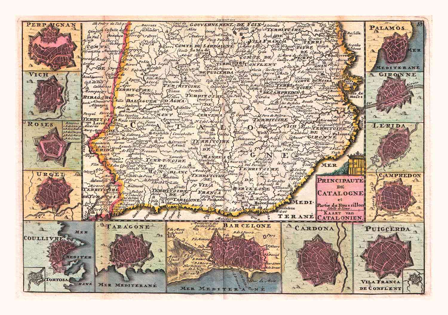 Kaart van de Spaanse provincie Catalonia met rondom 13 stadsplattegrondjes. In 1747 uitgegeven door La Feuille.