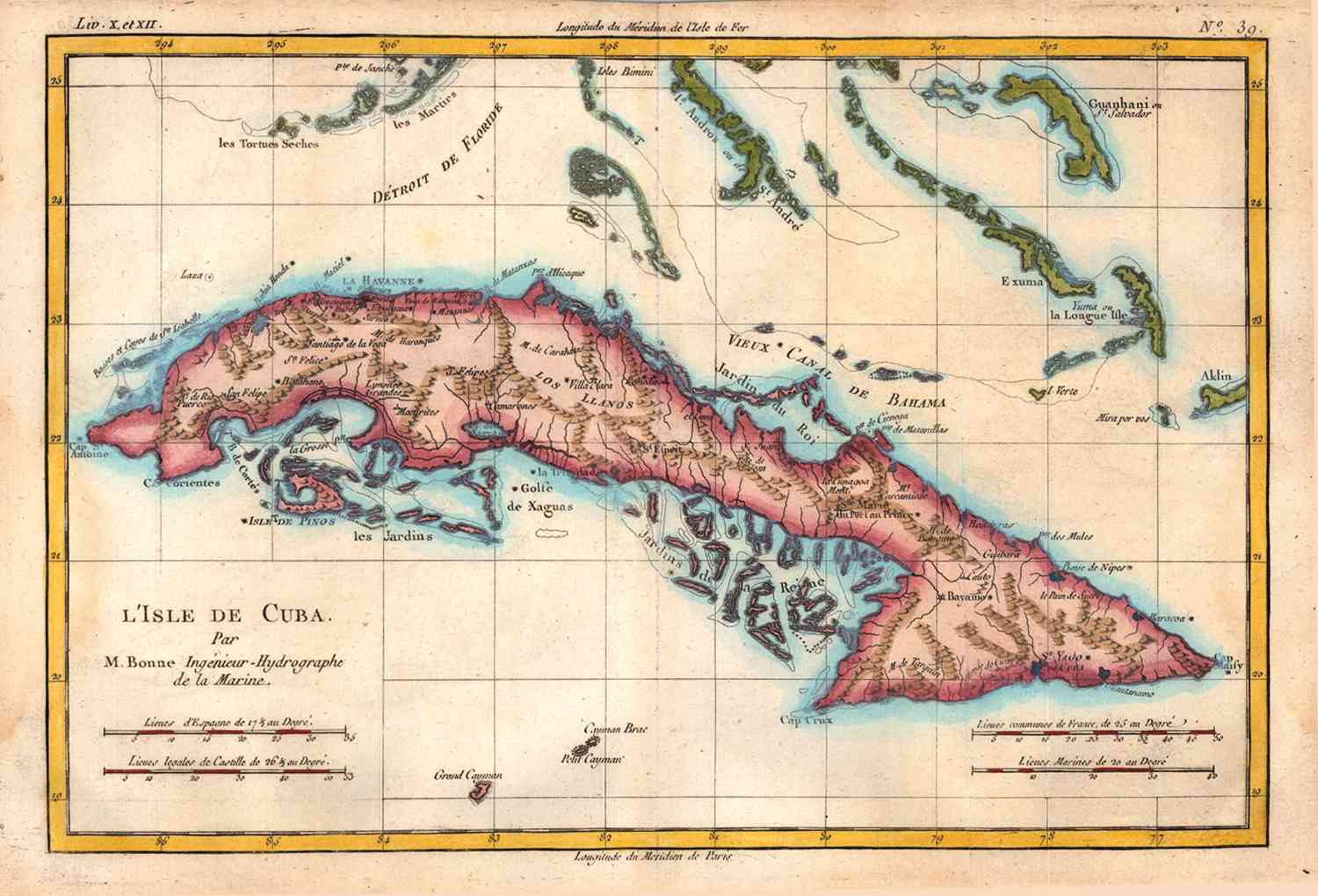 Kaart van het eiland Cuba, in 1780 uitgegeven door Bonne.