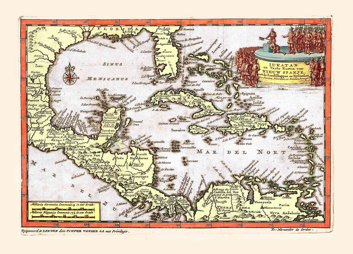 Kaart van het Caribisch gebied, Midden Amerika, in 1706 uitgegeven door Pieter van der Aa.