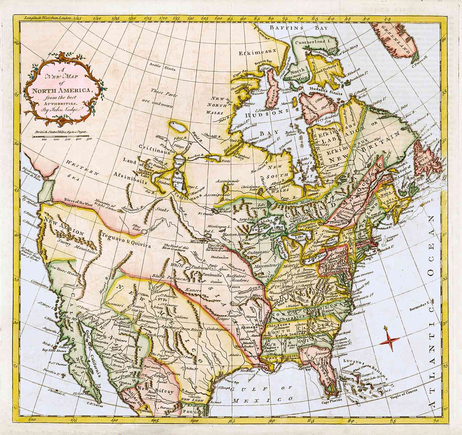 Kaart van Noord Amerika, in 1763 uitgegeven door John Lodge.