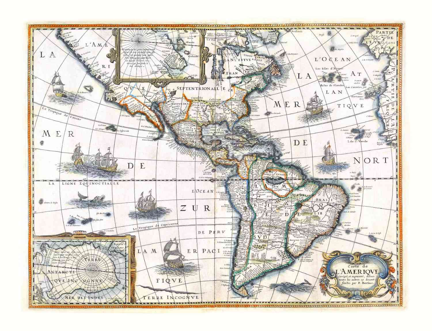 Kaart van Noord en Zuid Amerika, in 1627 uitgegeven door Bertius.