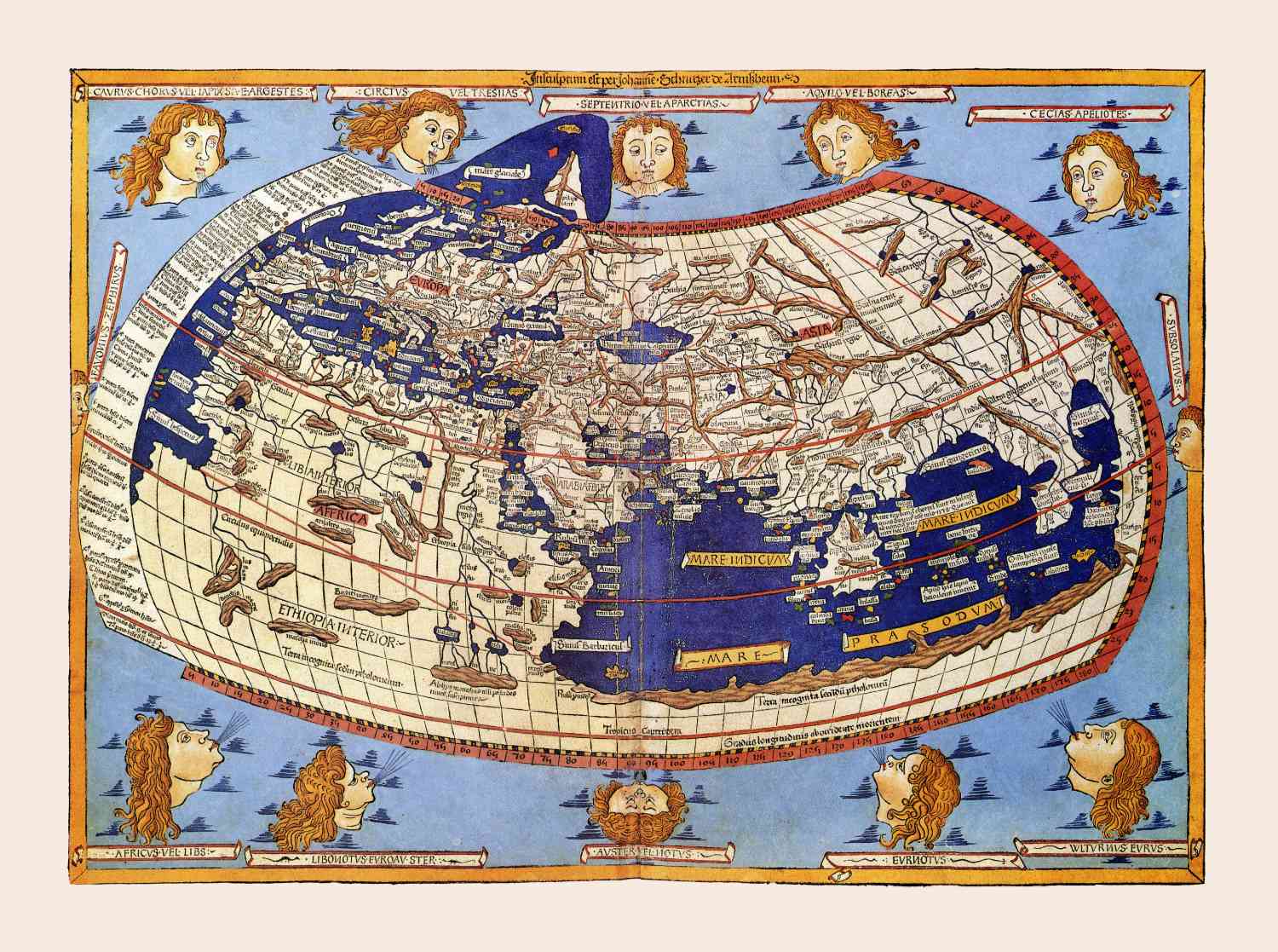 Een zeer vroege wereldkaart, gebaseerd op de metingen van Ptolemaeus (87-150 na Chr.). In 1482 uitgegeven door Nicolaus Germanus.Amerika en Australië waren nog niet ontdekt en ook het zuidelijk deel van Afrika was nog onbekend.