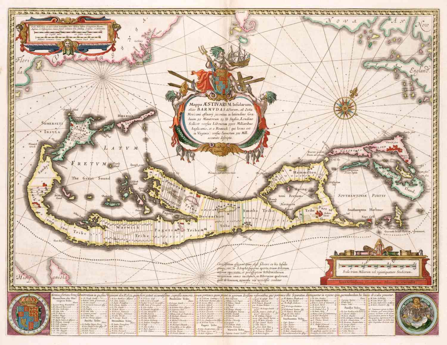Kaart van het eiland Bermuda in de Atlantische Oceaan, in 1663 uitgegeven door Joan Blaeu.