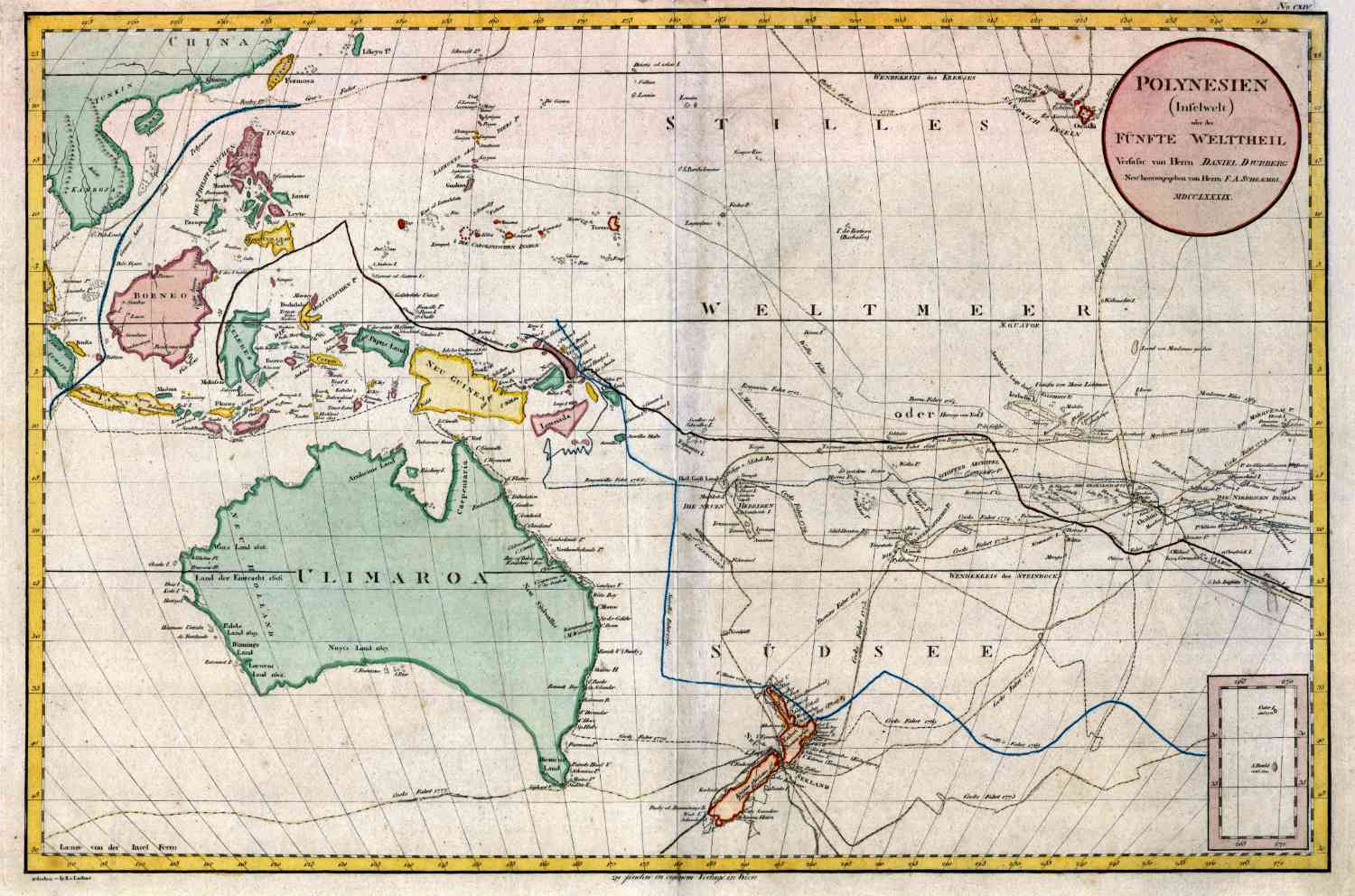 Kaart van de Grote Oceaan met Polynesië, Australië en Indonesische Eilanden, in 1789 uitgegeven door Schraembl.