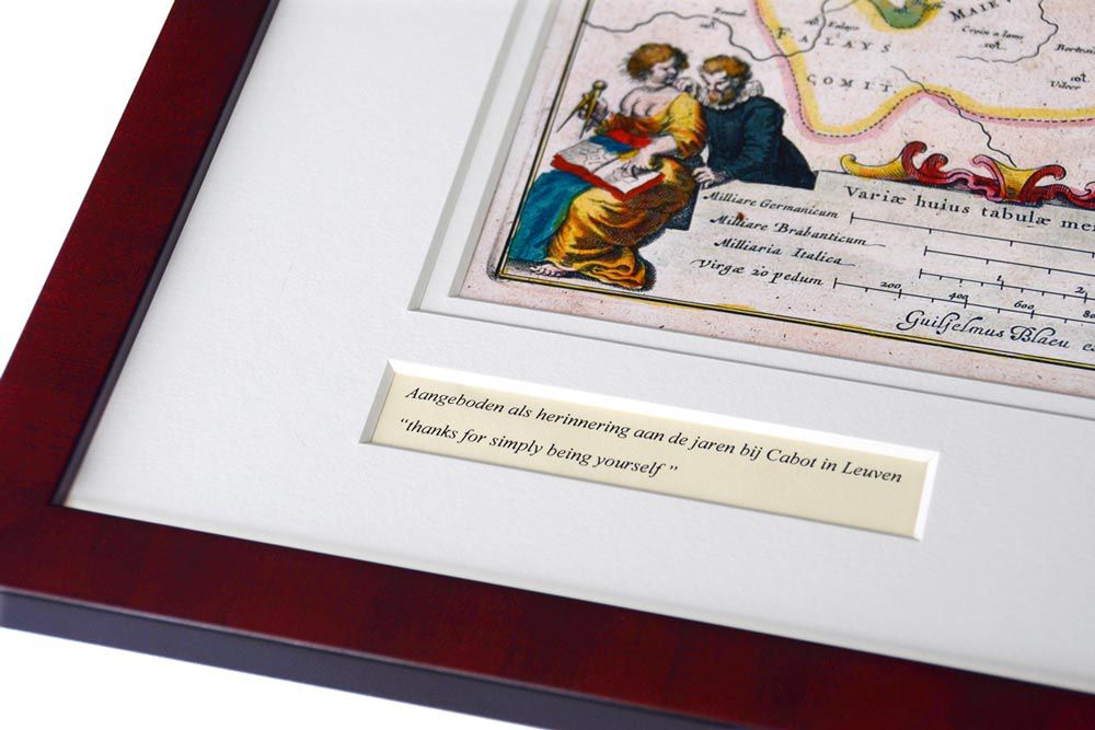 De kaarten worden in lijst geleverd, ambachtelijk ingelijst met dubbel passepartout in een wortelnoten of mahoniehouten lijst. Tegen meerprijs van € 15,00 kan in het passepartout een uitsnede met een persoonlijke tekst worden aangebracht. (Zie bovenstaande foto).