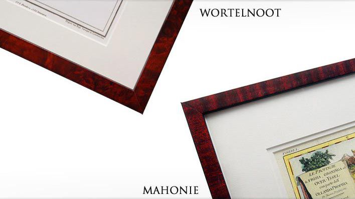 De kaarten worden standaard ingelijst en krijgen een dubbel passe-partout. Verder heeft u de keuze uit twee lijsten. Mahonie of wortelnoot.